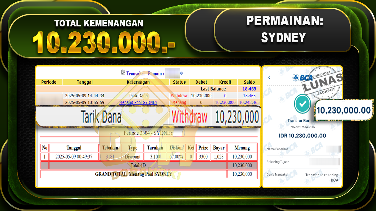 Bukti JP TOGEL SYDNEY – ucapkan selamat kepada user id Henxxx atas kemenangan di TOGEL SYDNEY dengan total kemenangan Rp.10.230.000,- . Yang pasti nya langsung LUNAS sesuai bukti ya bosku. Dorahoki nih bosku berapapun akan tetap kami bayar lunas ya bosku.