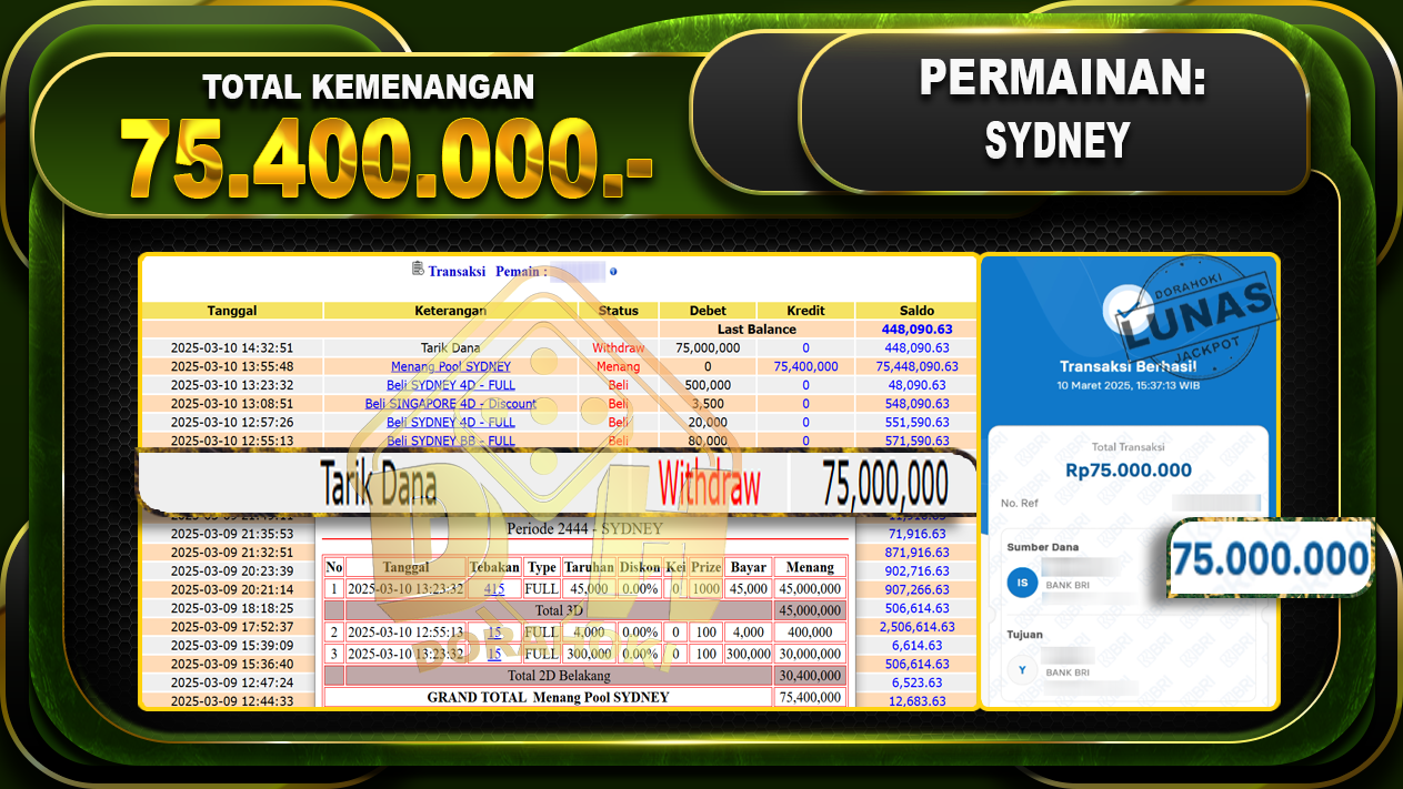 Bukti JP TOGEL SYDNEY – ucapkan selamat kepada user id Gerxxx atas kemenangan di  TOGEL SYDNEY  dengan total kemenangan Rp.75.400.000,- . Yang pasti nya langsung LUNAS sesuai bukti ya bosku. Dorahoki nih bosku berapapun akan tetap kami bayar lunas ya bosku.