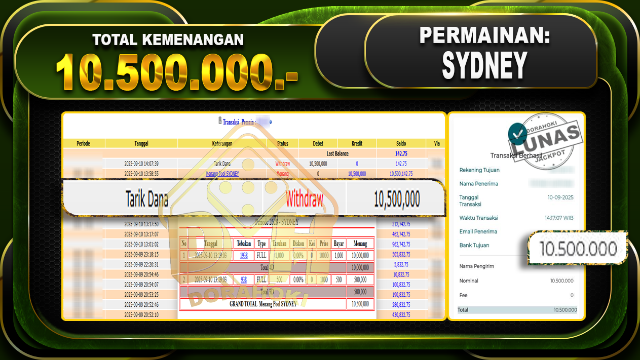 Bukti JP TOGEL SYDNEY – ucapkan selamat kepada user id Detxxxx atas kemenangan di  TOGEL SYDNEY dengan total kemenangan Rp.10,500,000,- Yang pasti nya langsung LUNAS sesuai bukti ya bosku. Dorahoki nih bosku berapapun akan tetap kami bayar lunas ya bosku