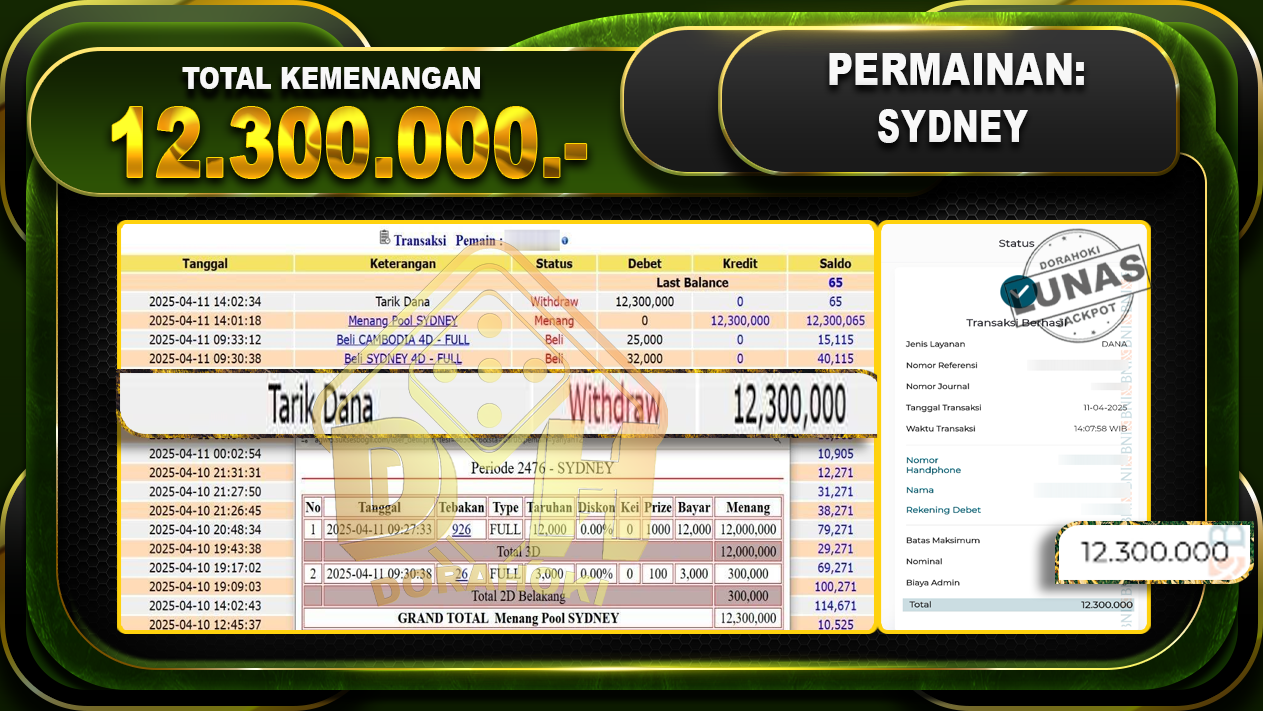 Bukti JP TOGEL SYDNEY – ucapkan selamat kepada user id Yanxxx atas kemenangan di  TOGEL SYDNEY  dengan total kemenangan Rp.12.300.000,- . Yang pasti nya langsung LUNAS sesuai bukti ya bosku. Dorahoki nih bosku berapapun akan tetap kami bayar lunas ya bosku.