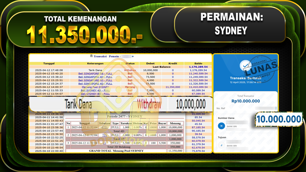 Bukti JP TOGEL SYDNEY – ucapkan selamat kepada user id Ncixxx atas kemenangan di TOGEL SYDNEY dengan total kemenangan Rp.11.350.000,- . Yang pasti nya langsung LUNAS sesuai bukti ya bosku. Dorahoki nih bosku berapapun akan tetap kami bayar lunas ya bosku.