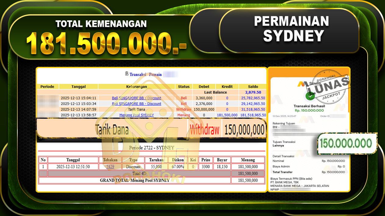 Bukti JP TOGEL SYDNEY – ucapkan selamat kepada user id jilxx atas kemenangan di TOGEL SYDNEY dengan total kemenangan Rp.181,500,000,- Yang pasti nya langsung LUNAS sesuai bukti ya bosku. Dorahoki nih bosku berapapun akan tetap kami bayar lunas ya bosku