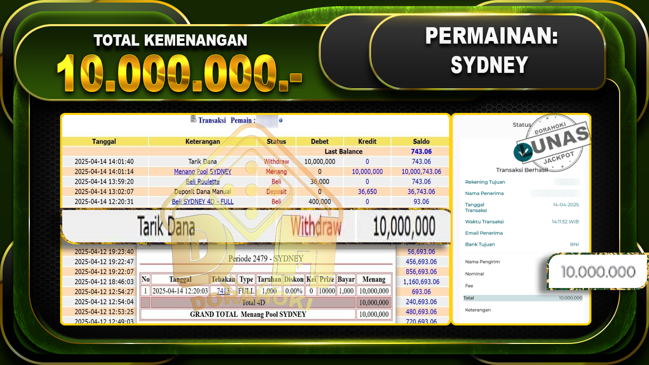Bukti JP TOGEL SYDNEY – ucapkan selamat kepada user id Jawxxx atas kemenangan di  TOGEL SYDNEY  dengan total kemenangan Rp.10.000.000,- . Yang pasti nya langsung LUNAS sesuai bukti ya bosku. Dorahoki nih bosku berapapun akan tetap kami bayar lunas ya bosku.
