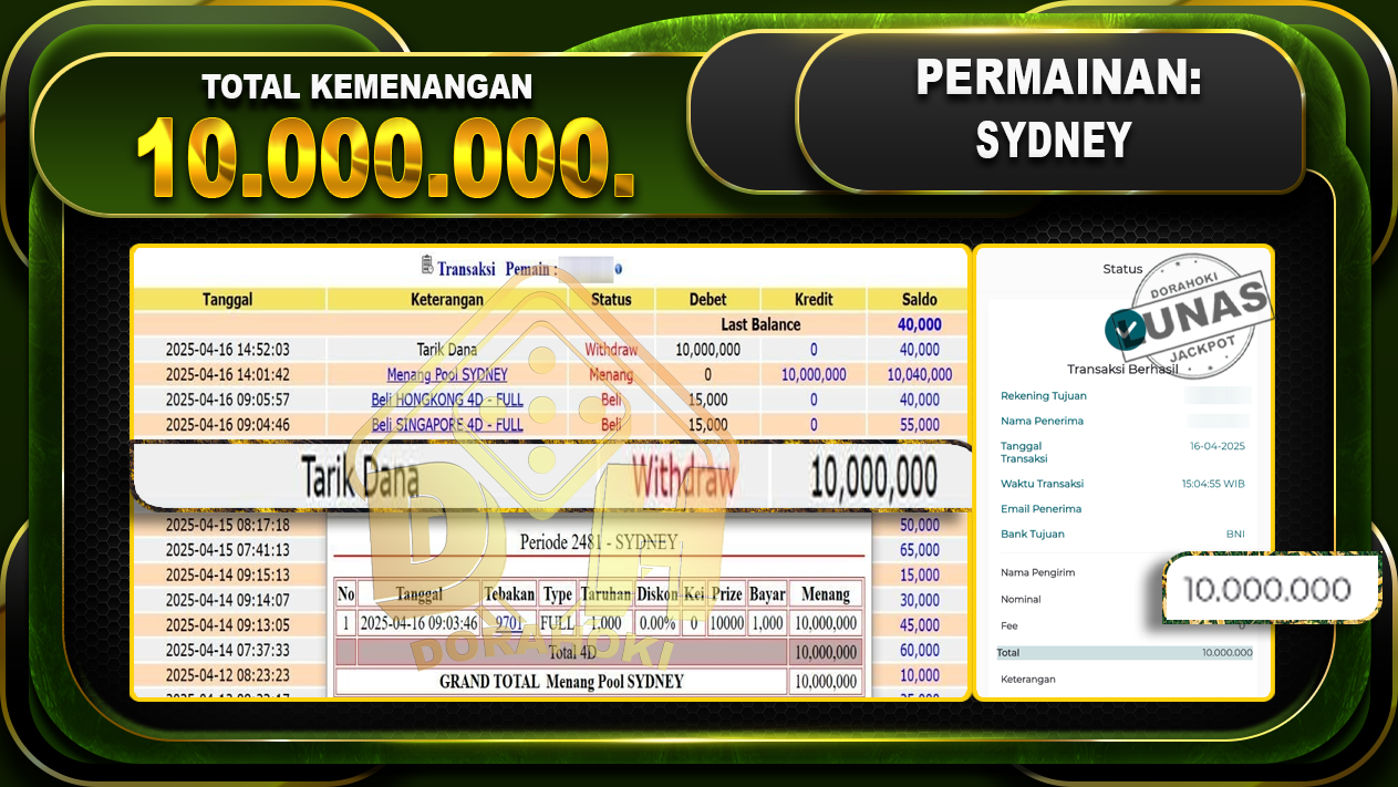 Bukti JP TOGEL SYDNEY – ucapkan selamat kepada user id Menxxx atas kemenangan di  TOGEL SYDNEY  dengan total kemenangan Rp.10.000.000,- . Yang pasti nya langsung LUNAS sesuai bukti ya bosku. Dorahoki nih bosku berapapun akan tetap kami bayar lunas ya bosku.