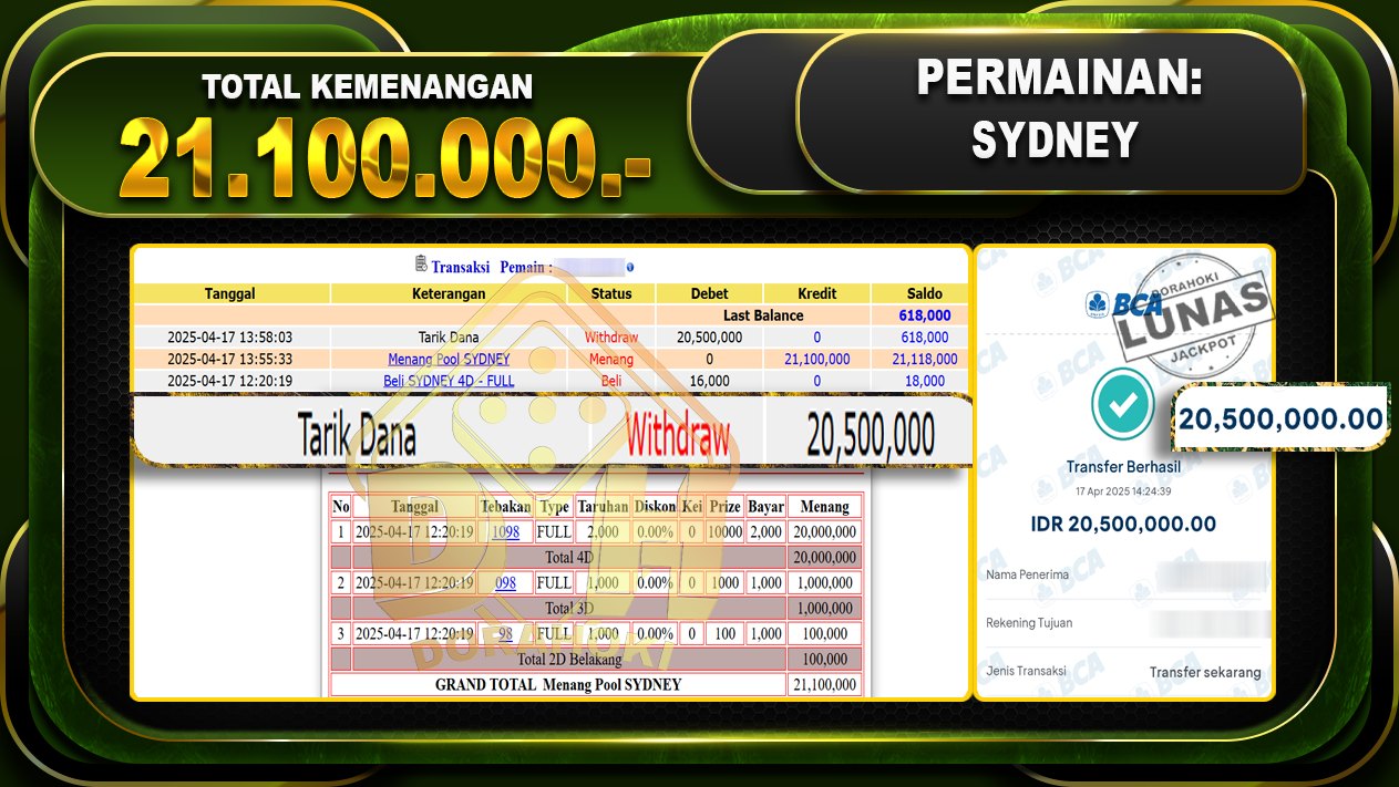 Bukti JP TOGEL SYDNEY – ucapkan selamat kepada user id Whyxxx atas kemenangan di TOGEL SYDNEY dengan total kemenangan Rp.21.100.000,- . Yang pasti nya langsung LUNAS sesuai bukti ya bosku. Dorahoki nih bosku berapapun akan tetap kami bayar lunas ya bosku.