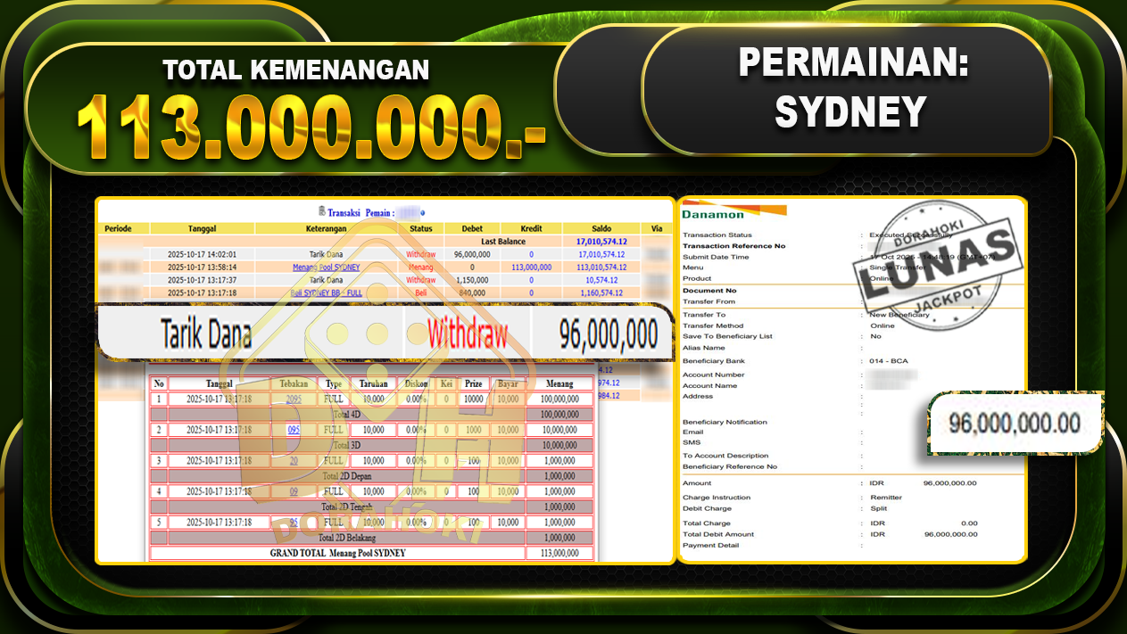 Bukti JP TOGEL SYDNEY – ucapkan selamat kepada user id yatxxxx atas kemenangan di TOGEL SYDNEY dengan total kemenangan Rp.113,000,000,- Yang pasti nya langsung LUNAS sesuai bukti ya bosku. Dorahoki nih bosku berapapun akan tetap kami bayar lunas ya bosku