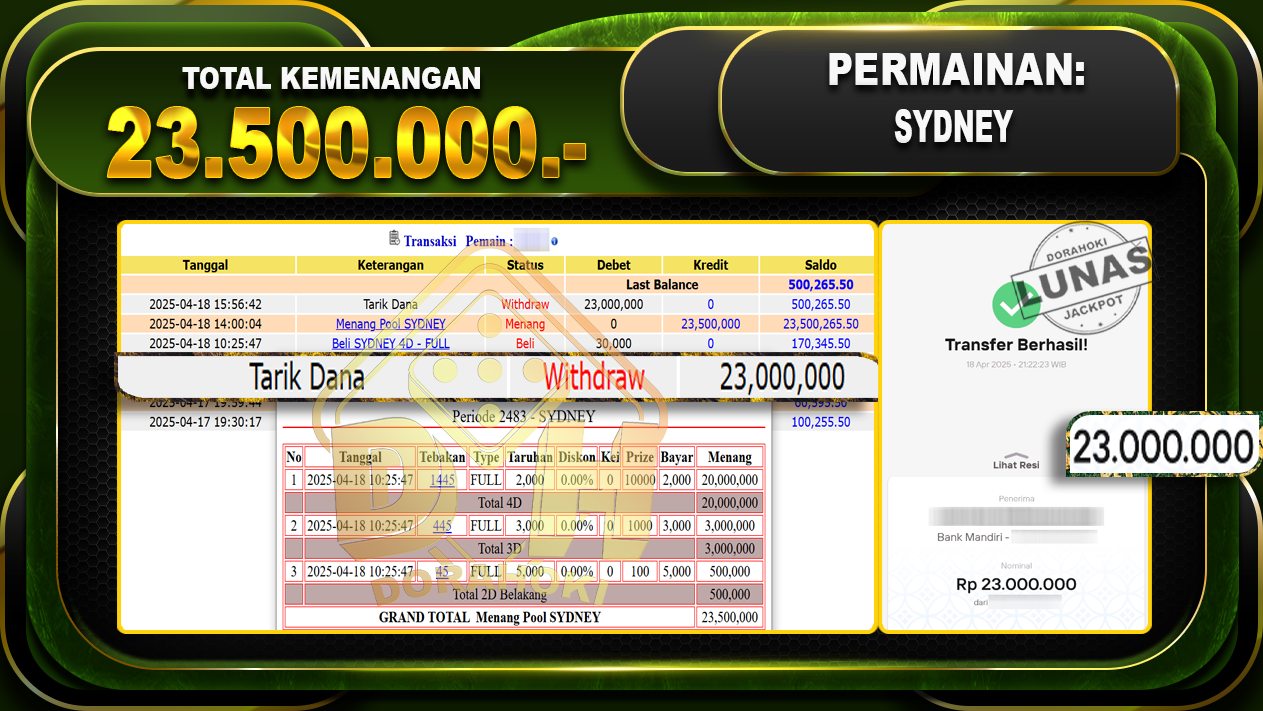 Bukti JP TOGEL SYDNEY – ucapkan selamat kepada user id Krisxxx atas kemenangan di  TOGEL SYDNEY  dengan total kemenangan Rp.23.500.000,- . Yang pasti nya langsung LUNAS sesuai bukti ya bosku. Dorahoki nih bosku berapapun akan tetap kami bayar lunas ya bosku.