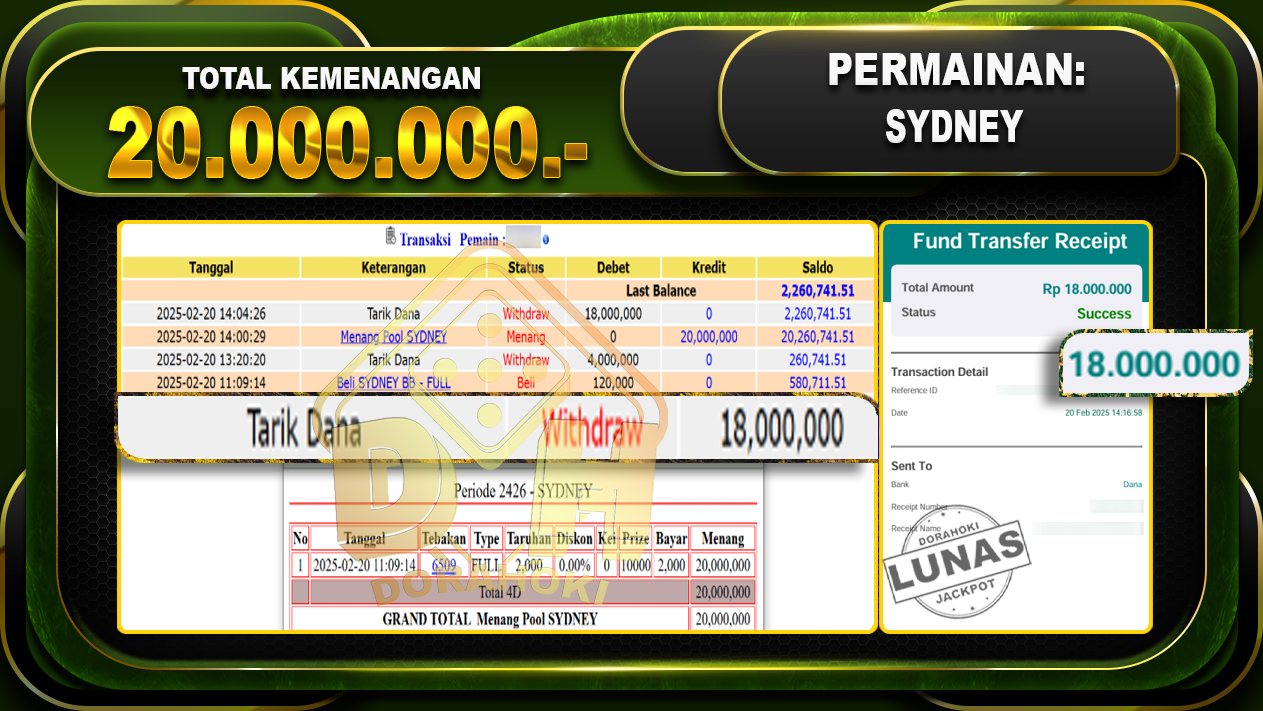 Bukti JP TOGEL SYDNEY – ucapkan selamat kepada user id sibxxx atas kemenangan di  TOGEL SYDNEY  dengan total kemenangan Rp.20.000.000,- . Yang pasti nya langsung LUNAS sesuai bukti ya bosku. Dorahoki nih bosku berapapun akan tetap kami bayar lunas ya bosku.