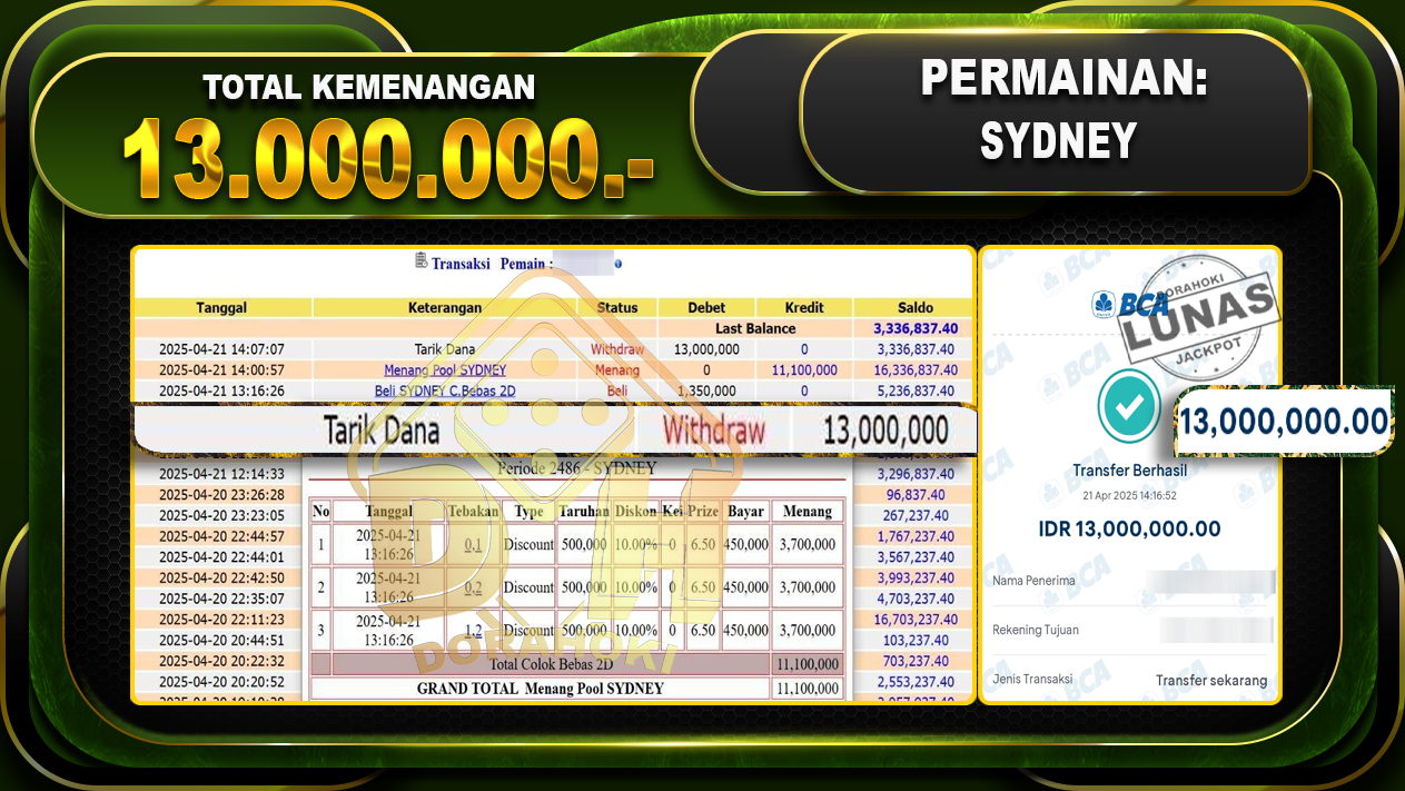 Bukti JP TOGEL SYDNEY – ucapkan selamat kepada user id Hafxxx atas kemenangan di TOGEL SYDNEY dengan total kemenangan Rp.13.000.000,- . Yang pasti nya langsung LUNAS sesuai bukti ya bosku. Dorahoki nih bosku berapapun akan tetap kami bayar lunas ya bosku.