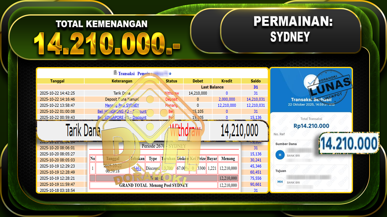 Bukti JP TOGEL SYDNEY – ucapkan selamat kepada user id phlxxx atas kemenangan di TOGEL SYDNEY dengan total kemenangan Rp.14,210,000,- Yang pasti nya langsung LUNAS sesuai bukti ya bosku. Dorahoki nih bosku berapapun akan tetap kami bayar lunas ya bosku