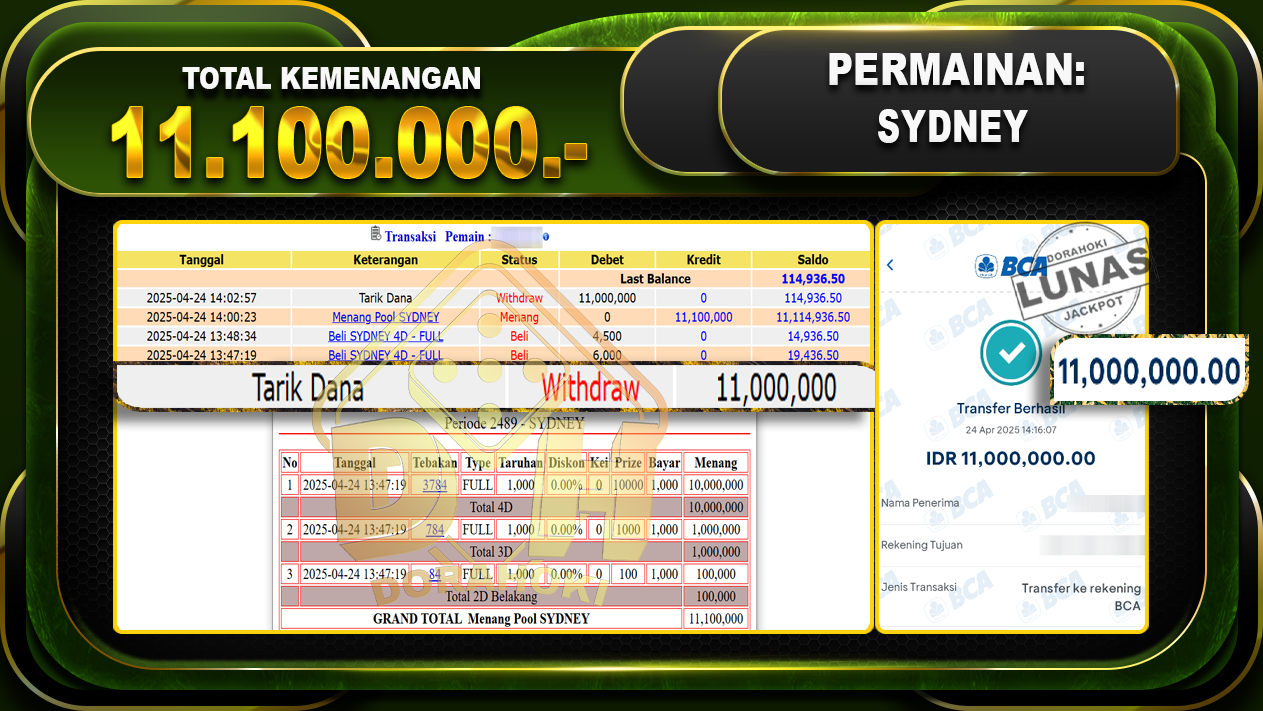 Bukti JP TOGEL SYDNEY – ucapkan selamat kepada user id Gabxxx atas kemenangan di TOGEL SYDNEY dengan total kemenangan Rp.11.100.000,- . Yang pasti nya langsung LUNAS sesuai bukti ya bosku. Dorahoki nih bosku berapapun akan tetap kami bayar lunas ya bosku.