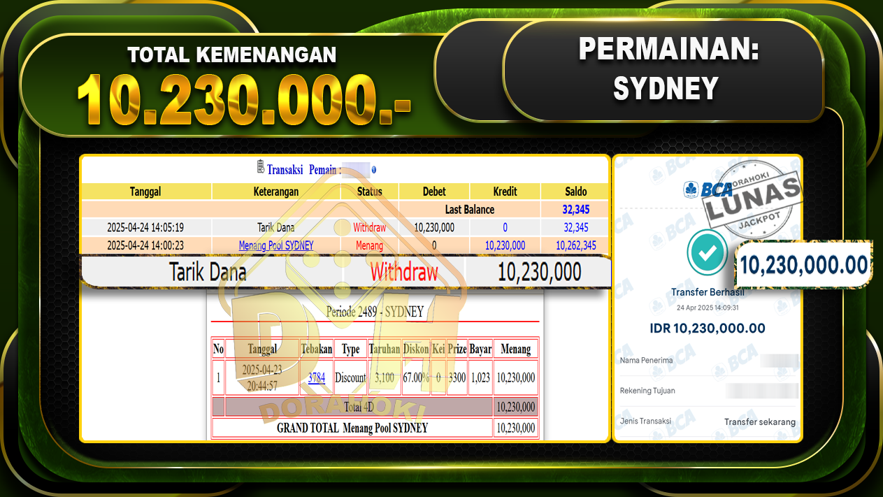 Bukti JP TOGEL SYDNEY – ucapkan selamat kepada user id Estxxx atas kemenangan di TOGEL SYDNEY dengan total kemenangan Rp.10.230.000,- . Yang pasti nya langsung LUNAS sesuai bukti ya bosku. Dorahoki nih bosku berapapun akan tetap kami bayar lunas ya bosku.
