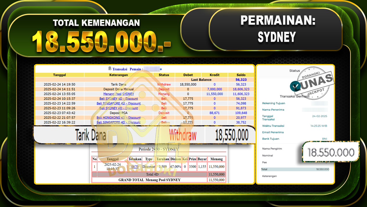 Bukti JP TOGEL SYDNEY – ucapkan selamat kepada user id destxxx atas kemenangan di TOGEL SYDNEY dengan total kemenangan Rp.18.550.000,- . Yang pasti nya langsung LUNAS sesuai bukti ya bosku. Dorahoki nih bosku berapapun akan tetap kami bayar lunas ya bosku.