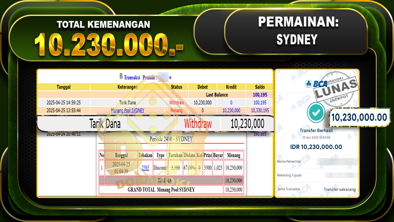 Bukti JP TOGEL SYDNEY – ucapkan selamat kepada user id Bioxxx atas kemenangan di TOGEL SYDNEY dengan total kemenangan Rp.10.230.000,- . Yang pasti nya langsung LUNAS sesuai bukti ya bosku. Dorahoki nih bosku berapapun akan tetap kami bayar lunas ya bosku.