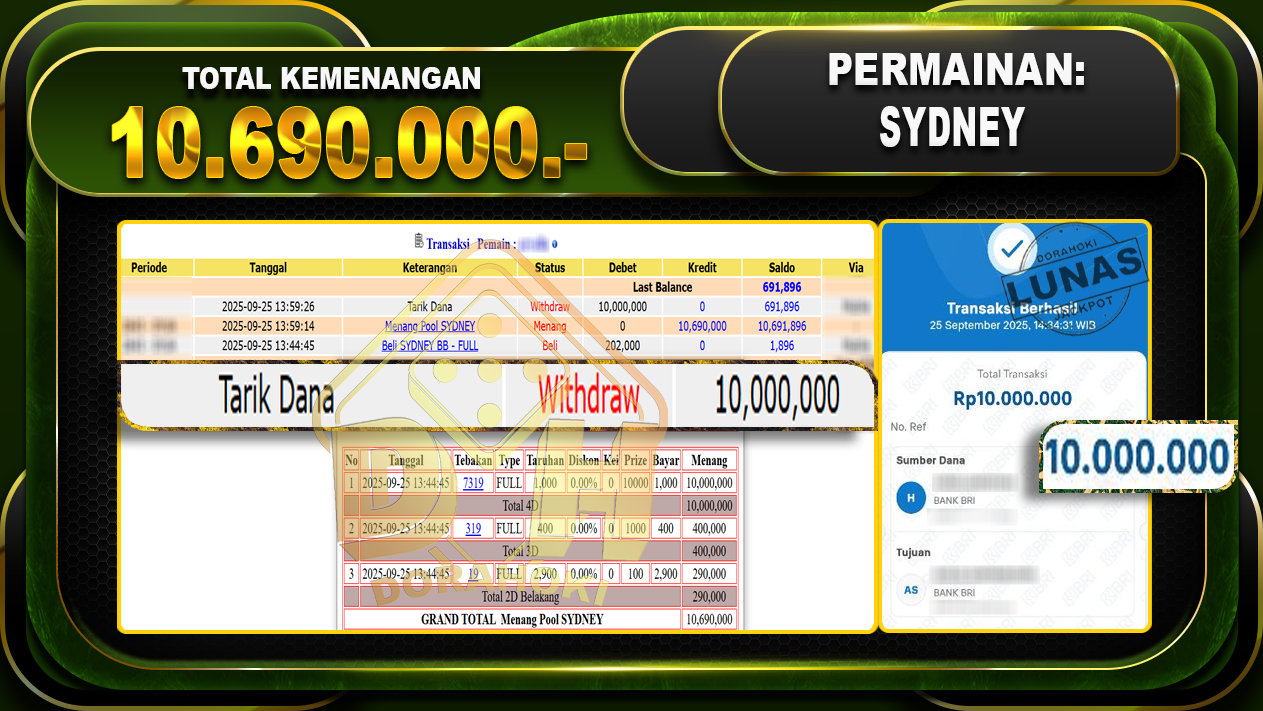 Bukti JP TOGEL SYDNEY – ucapkan selamat kepada user id arxxxx atas kemenangan di  TOGEL SYDNEY dengan total kemenangan Rp.10,690,000,- Yang pasti nya langsung LUNAS sesuai bukti ya bosku. Dorahoki nih bosku berapapun akan tetap kami bayar lunas ya bosku