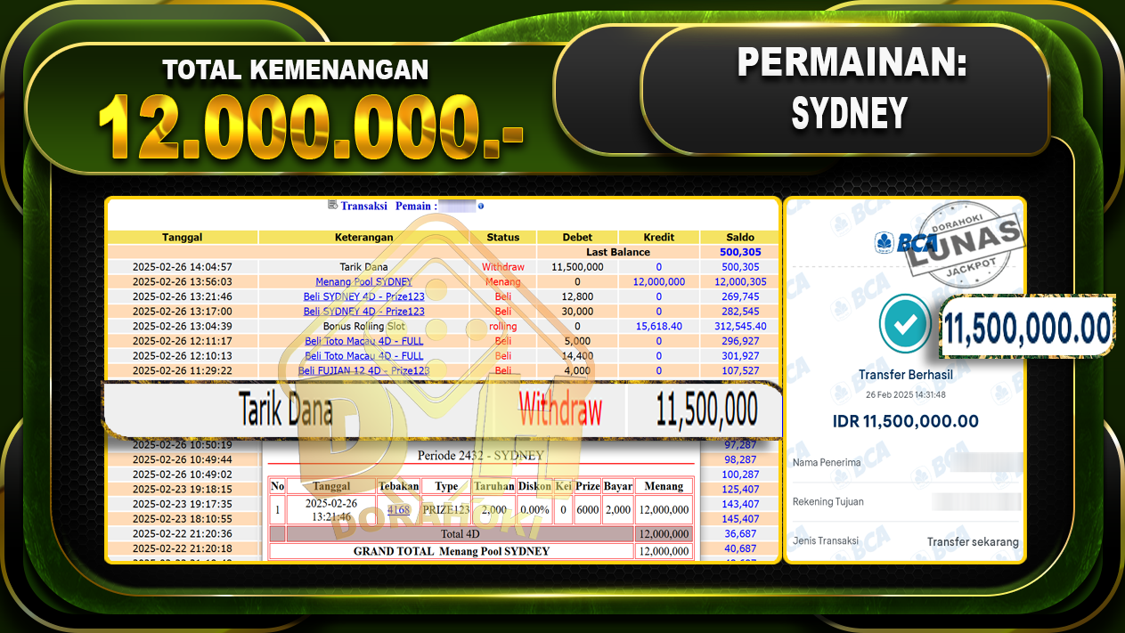 Bukti JP TOGEL SYDNEY – ucapkan selamat kepada user id Andxxx atas kemenangan di TOGEL SYDNEY dengan total kemenangan Rp.12.000.000,- . Yang pasti nya langsung LUNAS sesuai bukti ya bosku. Dorahoki nih bosku berapapun akan tetap kami bayar lunas ya bosku.