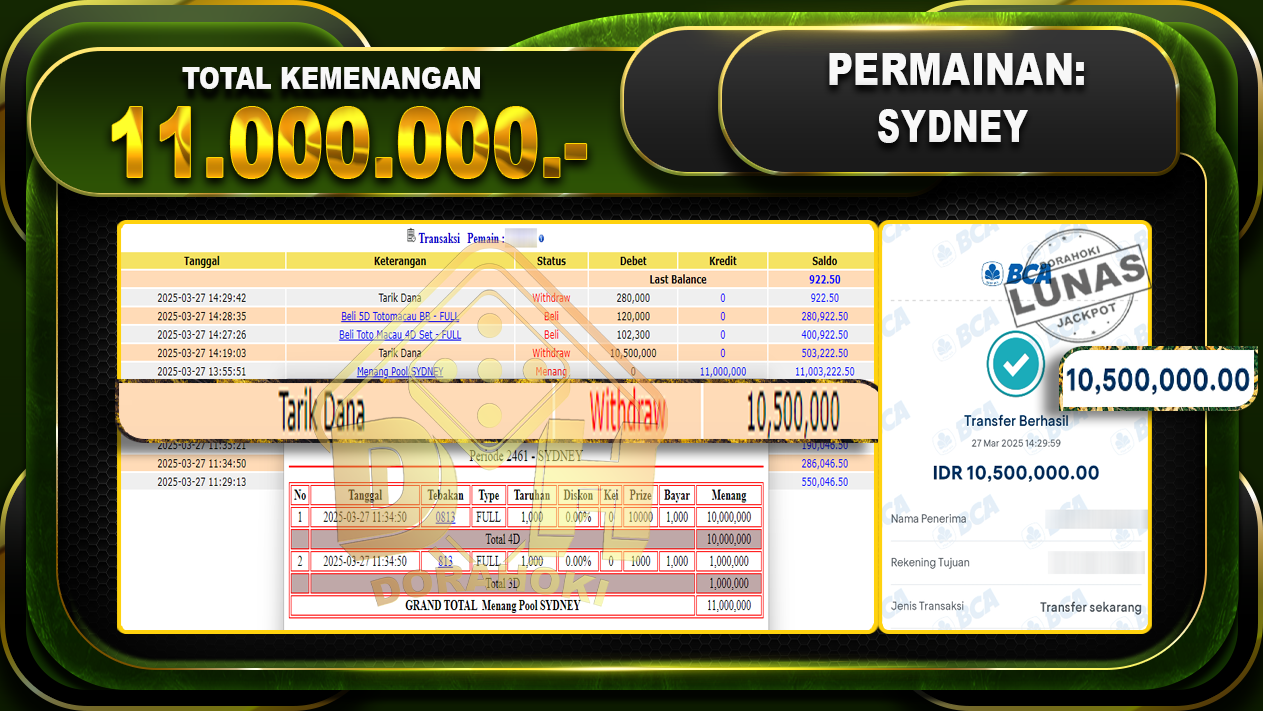 Bukti JP TOGEL SYDNEY – ucapkan selamat kepada user id Zulxxx atas kemenangan di TOGEL SYDNEY dengan total kemenangan Rp.11.000.000,- . Yang pasti nya langsung LUNAS sesuai bukti ya bosku. Dorahoki nih bosku berapapun akan tetap kami bayar lunas ya bosku.