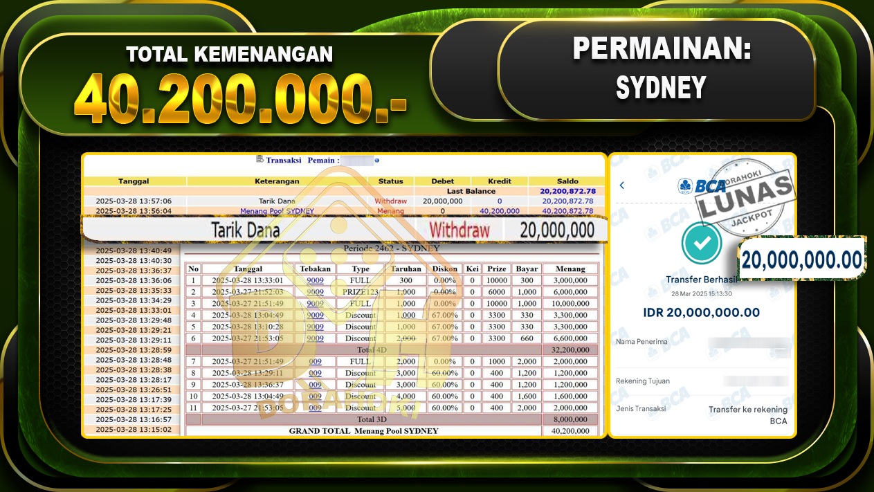 Bukti JP TOGEL SYDNEY – ucapkan selamat kepada user id Gabxxx atas kemenangan di TOGEL SYDNEY dengan total kemenangan Rp.40.200.000,- . Yang pasti nya langsung LUNAS sesuai bukti ya bosku. Dorahoki nih bosku berapapun akan tetap kami bayar lunas ya bosku.