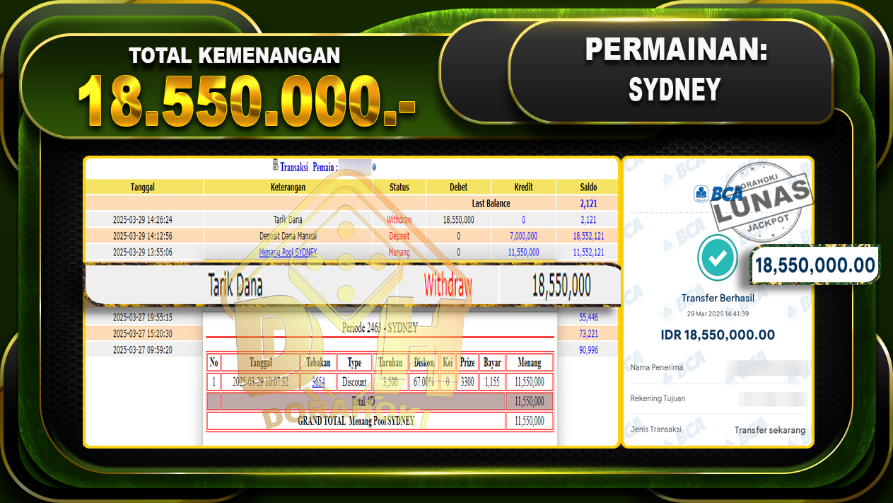 Bukti JP TOGEL SYDNEY – ucapkan selamat kepada user id Rorxxx atas kemenangan di  TOGEL SYDNEY  dengan total kemenangan Rp.18.550.000,- . Yang pasti nya langsung LUNAS sesuai bukti ya bosku. Dorahoki nih bosku berapapun akan tetap kami bayar lunas ya bosku.