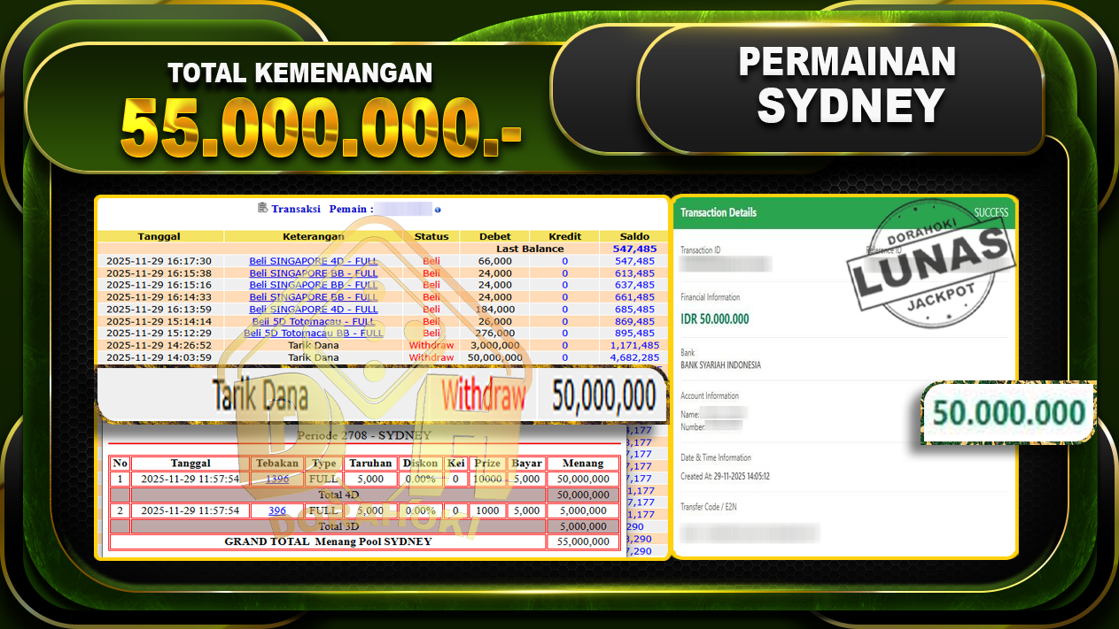 Bukti JP TOGEL SYDNEY – ucapkan selamat kepada user id ramxxxxx atas kemenangan di TOGEL SYDNEY dengan total kemenangan Rp.55,000,000,- Yang pasti nya langsung LUNAS sesuai bukti ya bosku. Dorahoki nih bosku berapapun akan tetap kami bayar lunas ya bosku