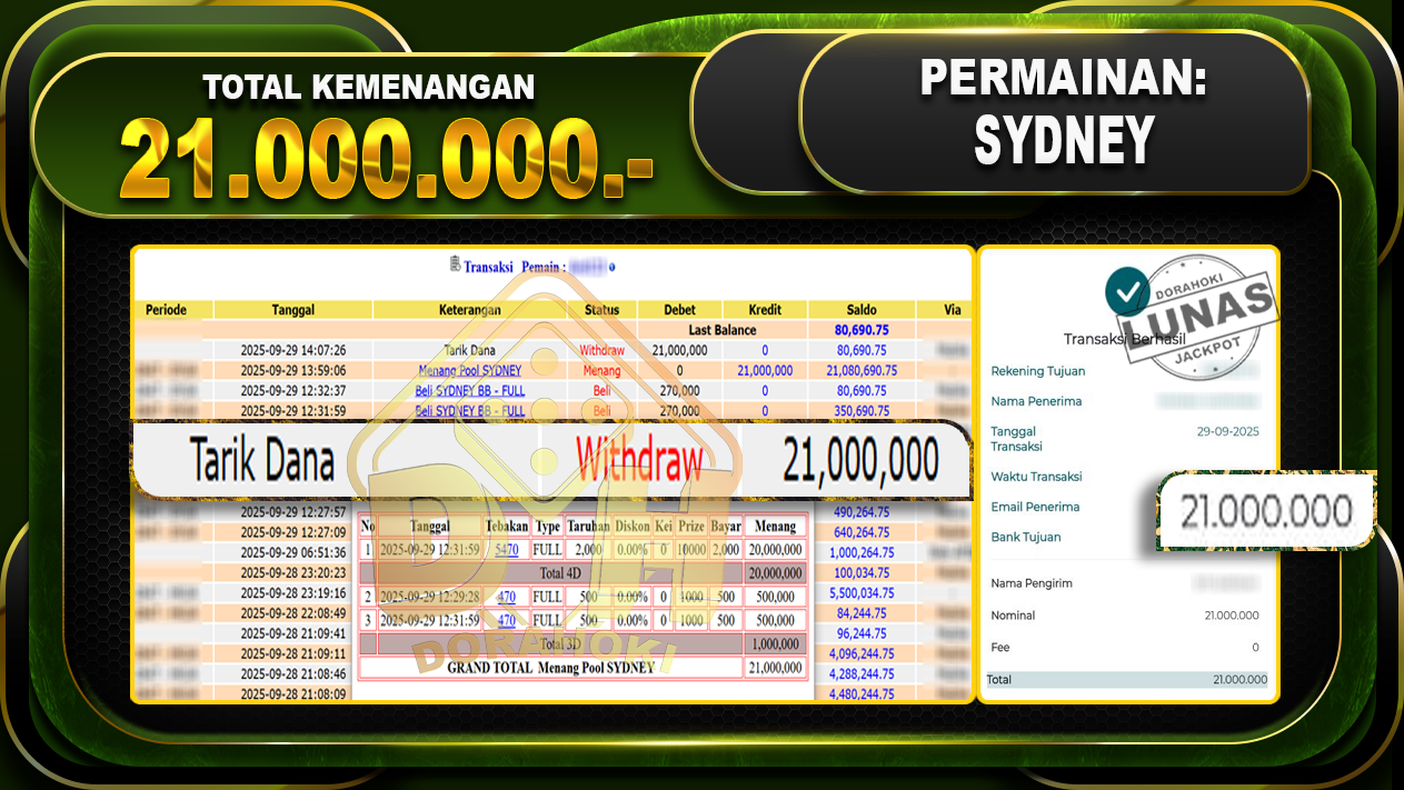 Bukti JP TOGEL SYDNEY – ucapkan selamat kepada user id detxxxx atas kemenangan di TOGEL SYDNEY dengan total kemenangan Rp.21,000,000,- Yang pasti nya langsung LUNAS sesuai bukti ya bosku. Dorahoki nih bosku berapapun akan tetap kami bayar lunas ya bosku
