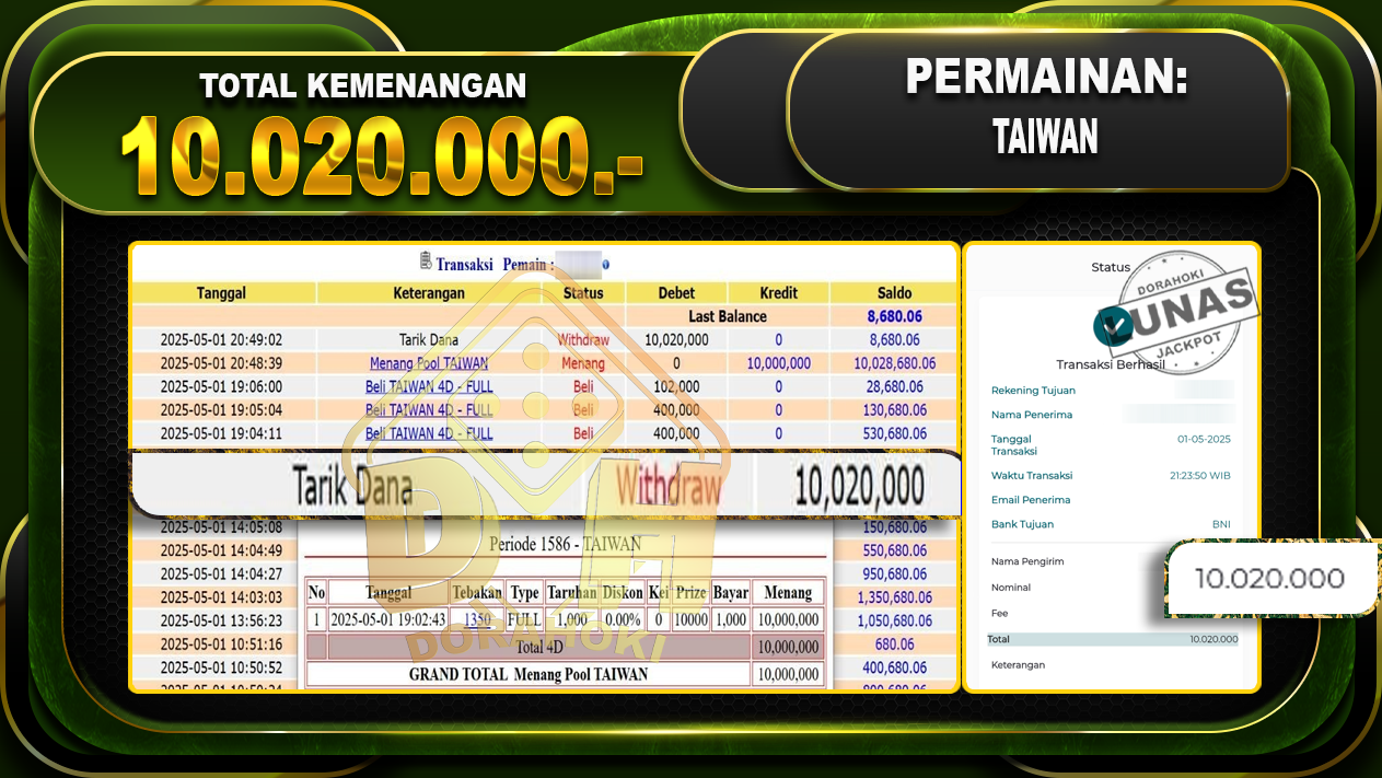 Bukti JP TOGEL TAIWAN- ucapkan selamat kepada user id Jawxxx atas kemenangan di  TOGEL TAIWAN dengan total kemenangan Rp.10.020.000,- . Yang pasti nya langsung LUNAS sesuai bukti ya bosku. Dorahoki nih bosku berapapun akan tetap kami bayar lunas ya bosku.