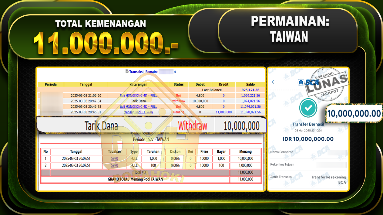 Bukti JP TOGEL TAIWAN- ucapkan selamat kepada user id Aguxxx atas kemenangan di  TOGEL TAIWAN dengan total kemenangan Rp.11.000.000,- . Yang pasti nya langsung LUNAS sesuai bukti ya bosku. Dorahoki nih bosku berapapun akan tetap kami bayar lunas ya bosku.