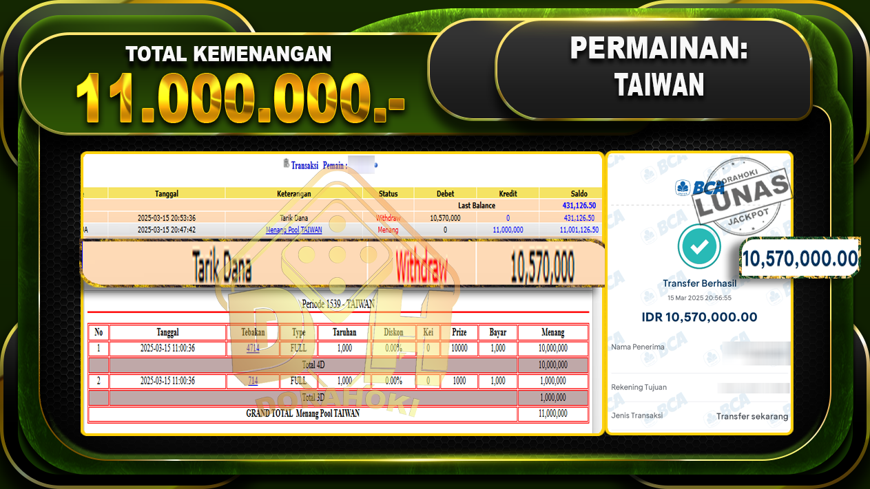 Bukti JP TOGEL TAIWAN- ucapkan selamat kepada user id Tosxxx atas kemenangan di TOGEL TAIWAN dengan total kemenangan Rp.11.000.000,- . Yang pasti nya langsung LUNAS sesuai bukti ya bosku. Dorahoki nih bosku berapapun akan tetap kami bayar lunas ya bosku.