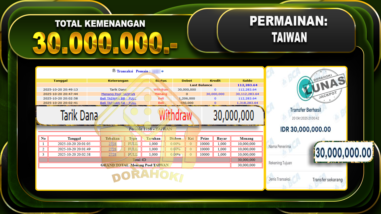 Bukti JP TOGEL TAIWAN – ucapkan selamat kepada user id gapxxx atas kemenangan di TOGEL TAIWAN dengan total kemenangan Rp.30.000.000,- Yang pasti nya langsung LUNAS sesuai bukti ya bosku. Dorahoki nih bosku berapapun akan tetap kami bayar lunas ya bosku