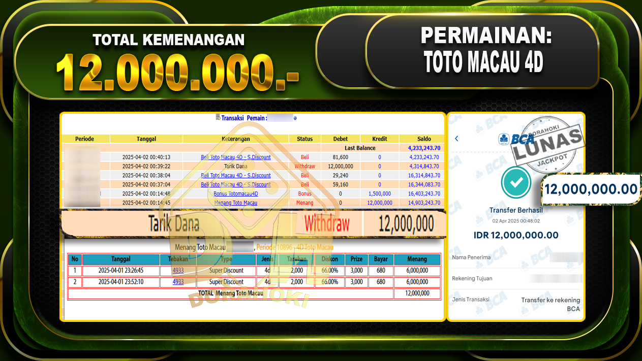 Bukti JP TOGEL TOTO MACAU 4D – ucapkan selamat kepada user id Bukti JP TOGEL TOTO MACAU 4D Dengan total kemenangan Rp12 Juta Rupiah yang tentunya di bayarkan langsung LUNAS & tanpa RIBET ya bosku ^^Mimxxx atas kemenangan di TOGEL TOTO MACAU 4D dengan total kemenangan Rp.12.000.000,- . Yang pasti nya langsung LUNAS sesuai bukti ya bosku. Dorahoki nih bosku berapapun akan tetap kami bayar lunas ya bosku.