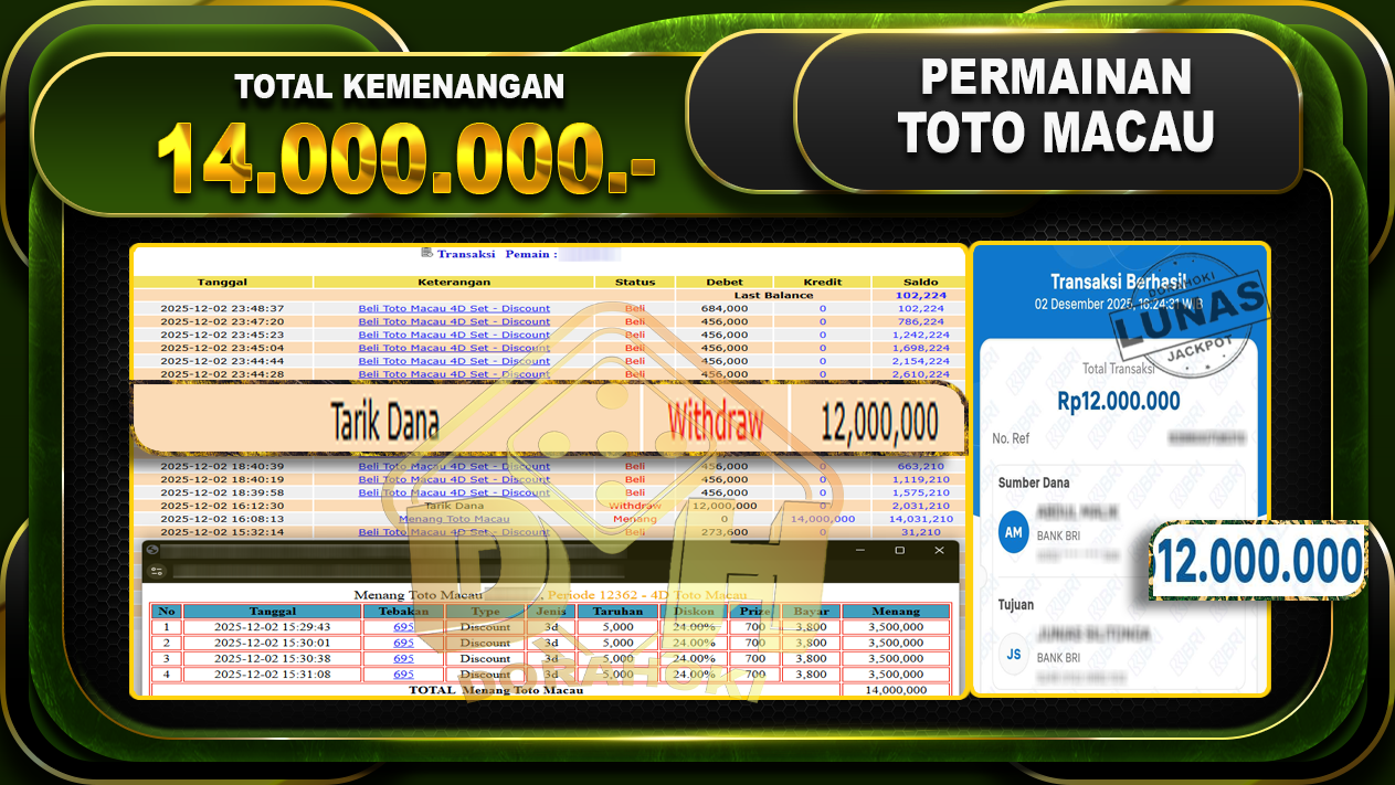 Bukti JP TOGEL TOTO MACAU 4D – ucapkan selamat kepada user id saoxxxx atas kemenangan di TOGEL TOTO MACAU 4D dengan total kemenangan Rp.14,000,000,- Yang pasti nya langsung LUNAS sesuai bukti ya bosku. Dorahoki nih bosku berapapun akan tetap kami bayar lunas ya bosku