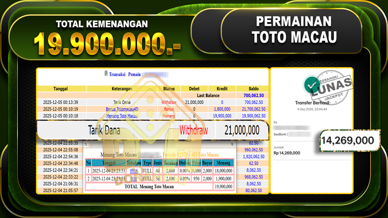 Bukti JP TOGEL TOTO MACAU 4D – ucapkan selamat kepada user id rahxxxx atas kemenangan di TOGEL TOTO MACAU 4D dengan total kemenangan Rp.19,900,000,- Yang pasti nya langsung LUNAS sesuai bukti ya bosku. Dorahoki nih bosku berapapun akan tetap kami bayar lunas ya bosku