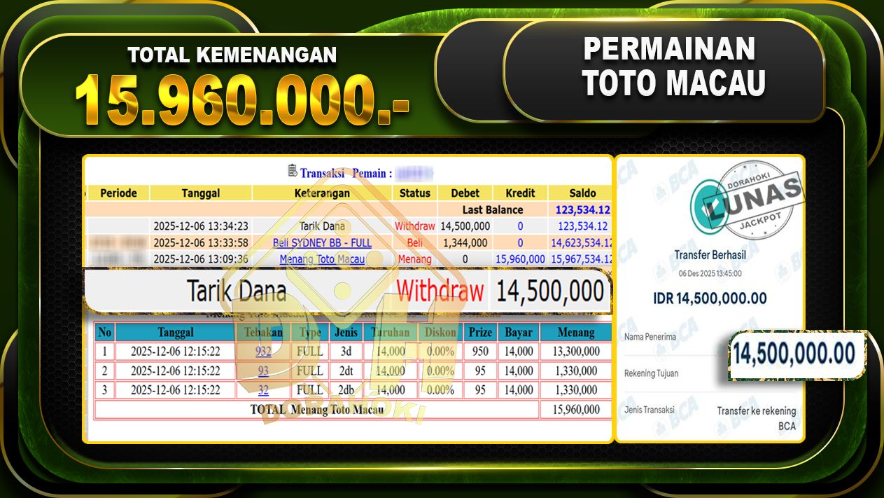 Bukti JP TOGEL TOTO MACAU 4D – ucapkan selamat kepada user id yatxxx atas kemenangan di TOGEL TOTO MACAU 4D dengan total kemenangan Rp.15,960,000,- Yang pasti nya langsung LUNAS sesuai bukti ya bosku. Dorahoki nih bosku berapapun akan tetap kami bayar lunas ya bosku