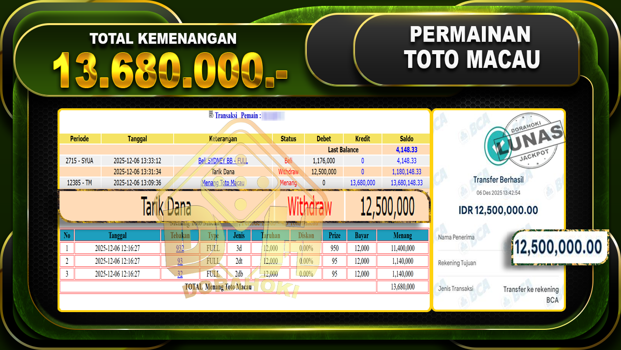 Bukti JP TOGEL TOTO MACAU 4D – ucapkan selamat kepada user id harxxx atas kemenangan di TOGEL TOTO MACAU 4D dengan total kemenangan Rp.13,680,000,- Yang pasti nya langsung LUNAS sesuai bukti ya bosku. Dorahoki nih bosku berapapun akan tetap kami bayar lunas ya bosku