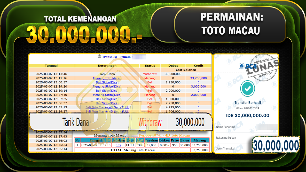 Bukti JP TOGEL TOTO MACAU 4D – ucapkan selamat kepada user id Gapxxx atas kemenangan di TOGEL TOTO MACAU 4D dengan total kemenangan Rp.30.000.000,- . Yang pasti nya langsung LUNAS sesuai bukti ya bosku. Dorahoki nih bosku berapapun akan tetap kami bayar lunas ya bosku.