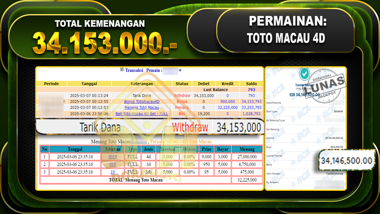 Bukti JP TOGEL TOTO MACAU 4D – ucapkan selamat kepada user id 900xxx atas kemenangan di TOGEL TOTO MACAU 4D dengan total kemenangan Rp.34.153.000,- . Yang pasti nya langsung LUNAS sesuai bukti ya bosku. Dorahoki nih bosku berapapun akan tetap kami bayar lunas ya bosku.