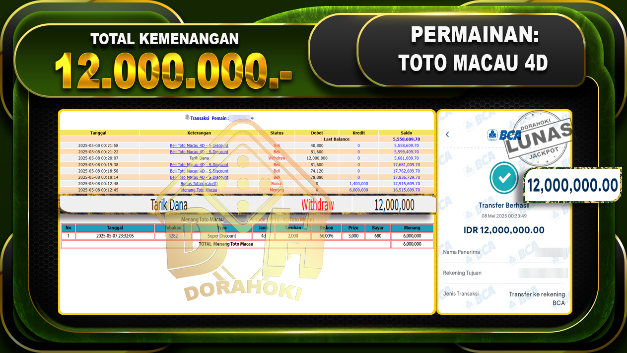 Bukti JP TOGEL TOTO MACAU 4D – ucapkan selamat kepada user id Rakxxx atas kemenangan di TOGEL TOTO MACAU 4D dengan total kemenangan Rp.12.000.000.,- . Yang pasti nya langsung LUNAS sesuai bukti ya bosku. Dorahoki nih bosku berapapun akan tetap kami bayar lunas ya bosku.
