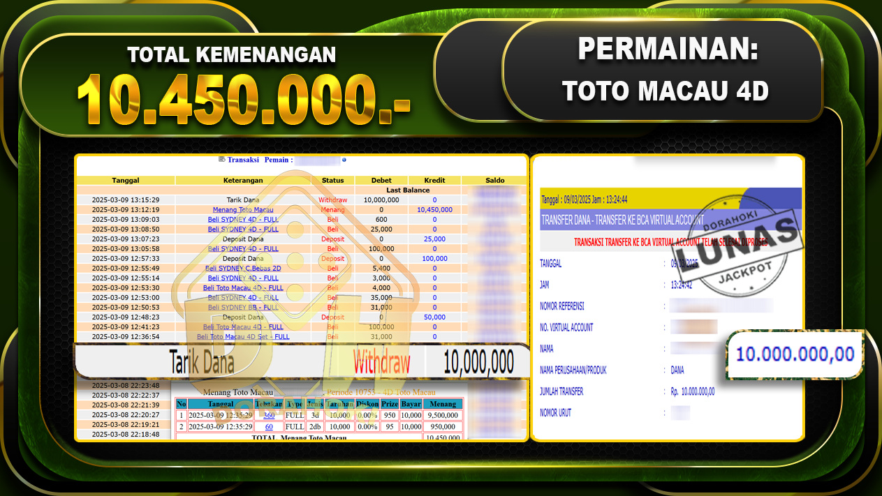 Bukti JP TOGEL TOTO MACAU 4D – ucapkan selamat kepada user id Anaxxx atas kemenangan di TOGEL TOTO MACAU 4D dengan total kemenangan Rp.10.450.000,- . Yang pasti nya langsung LUNAS sesuai bukti ya bosku. Dorahoki nih bosku berapapun akan tetap kami bayar lunas ya bosku.