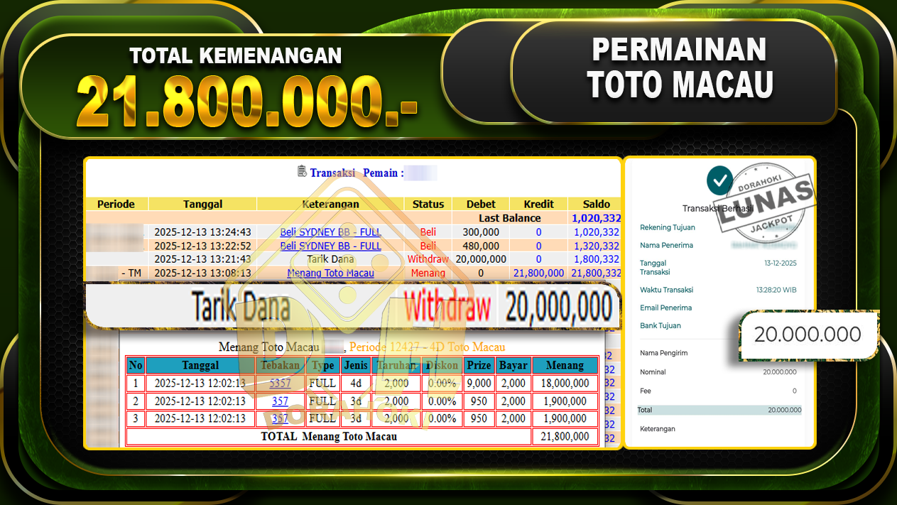 Bukti JP TOGEL TOTO MACAU 4D – ucapkan selamat kepada user id otix atas kemenangan di TOGEL TOTO MACAU 4D dengan total kemenangan Rp.21,800,000,- Yang pasti nya langsung LUNAS sesuai bukti ya bosku. Dorahoki nih bosku berapapun akan tetap kami bayar lunas ya bosku
