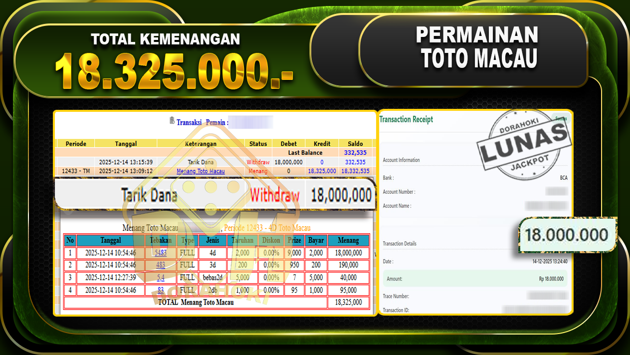 Bukti JP TOGEL TOTO MACAU 4D – ucapkan selamat kepada user id hayxxxxx atas kemenangan di TOGEL TOTO MACAU 4D dengan total kemenangan Rp.18,325,000,- Yang pasti nya langsung LUNAS sesuai bukti ya bosku. Dorahoki nih bosku berapapun akan tetap kami bayar lunas ya bosku