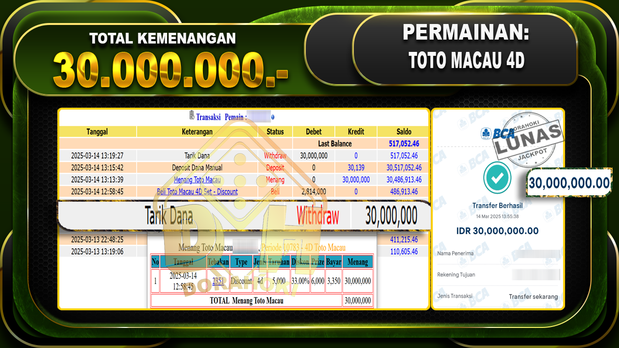 Bukti JP TOGEL TOTO MACAU 4D – ucapkan selamat kepada user id Kalxxx atas kemenangan di TOGEL TOTO MACAU 4D dengan total kemenangan Rp.30.000.000,- . Yang pasti nya langsung LUNAS sesuai bukti ya bosku. Dorahoki nih bosku berapapun akan tetap kami bayar lunas ya bosku.