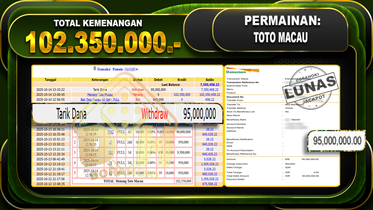 Bukti JP TOGEL TOTO MACAU 4D – ucapkan selamat kepada user id yatxxx atas kemenangan di  TOGEL TOTO MACAU 4D dengan total kemenangan Rp.102,350,000,- Yang pasti nya langsung LUNAS sesuai bukti ya bosku. Dorahoki nih bosku berapapun akan tetap kami bayar lunas ya bosku