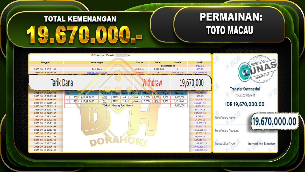 Bukti JP TOGEL TOTO MACAU 4D – ucapkan selamat kepada user id invxxxxxx atas kemenangan di  TOGEL TOTO MACAU 4D dengan total kemenangan Rp.19,670,000,- Yang pasti nya langsung LUNAS sesuai bukti ya bosku. Dorahoki nih bosku berapapun akan tetap kami bayar lunas ya bosku