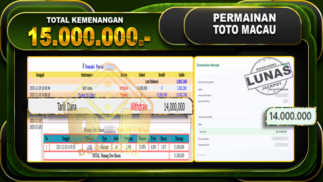 Bukti JP TOGEL TOTO MACAU 4D – ucapkan selamat kepada user id banxxxxx atas kemenangan di  TOGEL TOTO MACAU 4D dengan total kemenangan Rp.15,000,000,- Yang pasti nya langsung LUNAS sesuai bukti ya bosku. Dorahoki nih bosku berapapun akan tetap kami bayar lunas ya bosku