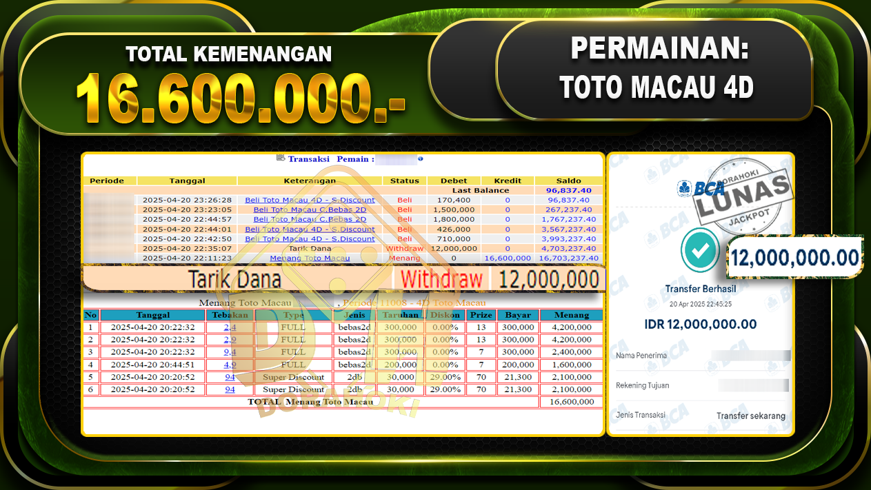 Bukti JP TOGEL TOTO MACAU 4D – ucapkan selamat kepada user id Hafxxx atas kemenangan di TOGEL TOTO MACAU 4D dengan total kemenangan Rp.16.600.000 .,- . Yang pasti nya langsung LUNAS sesuai bukti ya bosku. Dorahoki nih bosku berapapun akan tetap kami bayar lunas ya bosku.