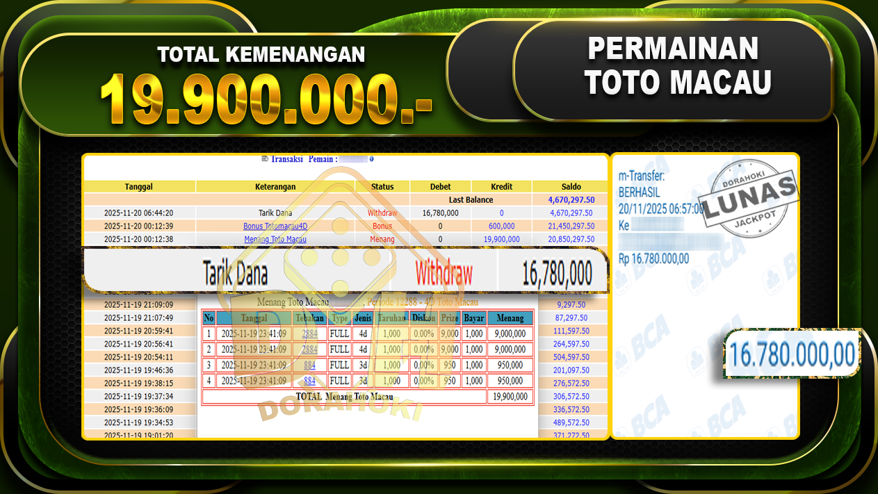 Bukti JP TOGEL TOTO MACAU 4D – ucapkan selamat kepada user id tosxxxx atas kemenangan di TOGEL TOTO MACAU 4D dengan total kemenangan Rp.19,900,000,- Yang pasti nya langsung LUNAS sesuai bukti ya bosku. Dorahoki nih bosku berapapun akan tetap kami bayar lunas ya bosku