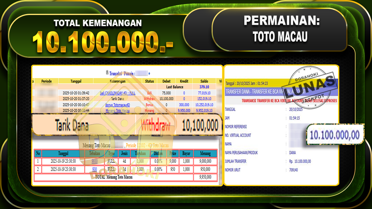 Bukti JP TOGEL TOTO MACAU 4D – ucapkan selamat kepada user id chaxxxx atas kemenangan di  TOGEL TOTO MACAU 4D dengan total kemenangan Rp.10,100,000,- Yang pasti nya langsung LUNAS sesuai bukti ya bosku. Dorahoki nih bosku berapapun akan tetap kami bayar lunas ya bosku