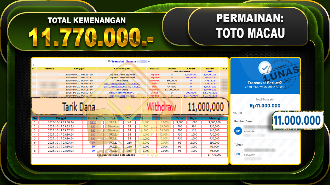 Bukti JP TOGEL TOTO MACAU 4D – ucapkan selamat kepada user id seaxxxx atas kemenangan di TOGEL TOTO MACAU 4D dengan total kemenangan Rp.11,770,000,- Yang pasti nya langsung LUNAS sesuai bukti ya bosku. Dorahoki nih bosku berapapun akan tetap kami bayar lunas ya bosku
