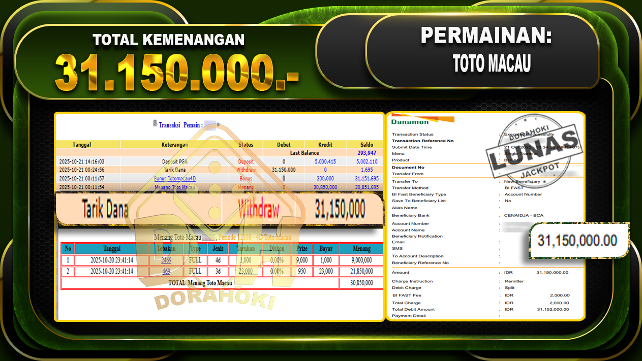Bukti JP TOGEL TOTO MACAU 4D – ucapkan selamat kepada user id buxxx atas kemenangan di TOGEL TOTO MACAU 4D dengan total kemenangan Rp.31,150,000,- Yang pasti nya langsung LUNAS sesuai bukti ya bosku. Dorahoki nih bosku berapapun akan tetap kami bayar lunas ya bosku