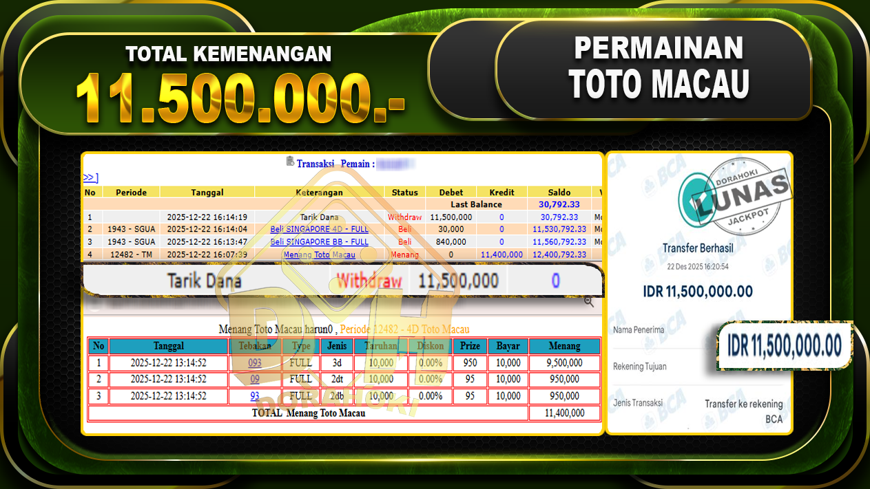 Bukti JP TOGEL TOTO MACAU 4D – ucapkan selamat kepada user id harxxxxx atas kemenangan di TOGEL TOTO MACAU 4D dengan total kemenangan Rp.11.500.000,- Yang pasti nya langsung LUNAS sesuai bukti ya bosku. Dorahoki nih bosku berapapun akan tetap kami bayar lunas ya bosku